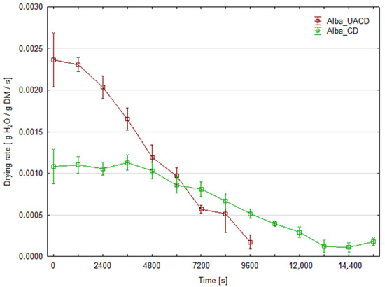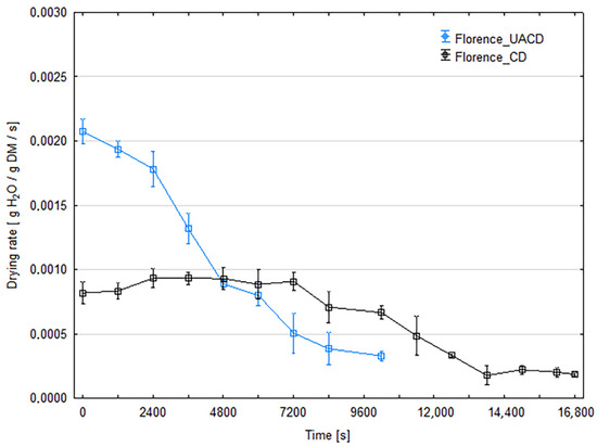 Drying rates of strawberry slices of the ‘Florence’ cultivar dried with (UACD) and without (CD) ultrasound assistance.