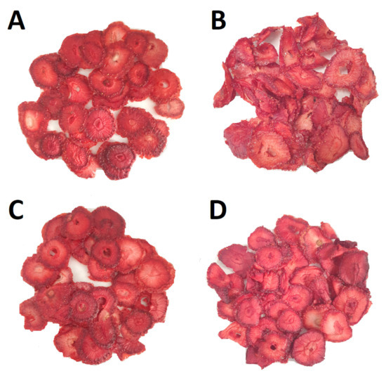 Dried strawberry slices: (A) Alba_CD, (B) Alba_UACD, (C) Florence_CD and (D) Florence_UACD.