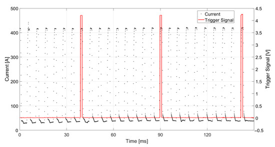 In the experiments, after detecting the current signal, a trigger signal was generated as is depicted in Figure 3, when the camera shutter opened, and an image was captured. The welding current pulse frequency was approximately 200 Hz. The trigger signal was generated at every tenth rising edge of the pulsed current, upon which the CMOS camera shutter was activated to capture molten pool images in synchronization with the welding process. Images were acquired at 20 Hz (one frame per 50 ms) with a fixed exposure time of 2.0 ms. Based on the weaving frequency, approximately 10 frames correspond to half a weaving cycle, and 20 frames correspond to a full cycle.