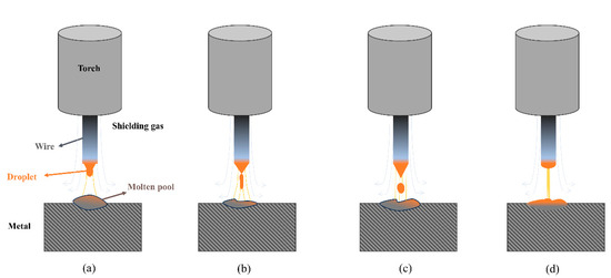 In the pulsed GMAW process, the wire is melted intermittently by alternating high- and low-current pulses. An ideal pulsed GMAW cycle typically consists of four distinct phases, as shown in Figure 4: droplet formation, droplet detachment, droplet transition, and arc maintenance. In the droplet formation phase, the wire end melts under peak current, primarily driven by electromagnetic contraction forces, forming a molten droplet. During the droplet detachment phase, the droplet is separated axially as the current drops to the base level, due to necking effects and surface tension imbalance. The droplet transition phase follows, where the detached droplet travels steadily toward the molten pool in the form of a jet, driven by arc force and plasma flow. Finally, the arc maintenance phase ensures arc stability using base current, regulates the dynamic behavior of the molten pool, and preheats the pool for the next cycle. In this way, droplets drop in a correct position to form a good bead. As pulsed MAG welding is a specific subtype of pulsed GMAW, the underlying principle remains applicable and can be referenced accordingly.