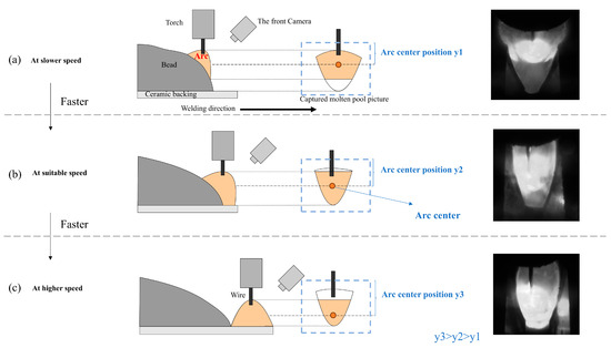 Variations in arc’s center position and molten pool characteristics under increasing welding speed: (a) at slower speed; (b) at suitable speed; (c) at higher speed.