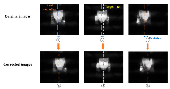 The procedure of correcting the molten pool’s movement in the images: (1–3) before transformation; (4–6) after transformation.
