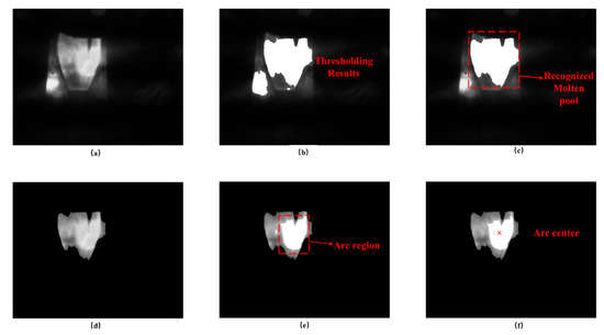 An example of arc center detection: (a) original image; (b) output of Otsu’s thresholding; (c) extracted high-intensity region, including both arc and molten pool; (d) retained high-intensity region after background removal; (e) arc region obtained through further segmentation; (f) calculated center of the arc region.