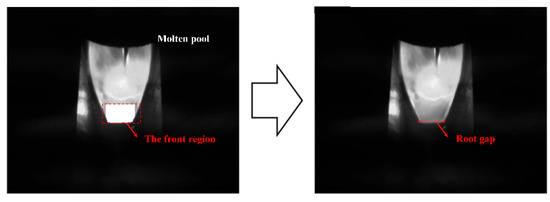 Moreover, since both the CMOS camera and the welding torch were mounted on a shared servo-driven mechanical structure that executed a controlled weaving motion to ensure adequate groove filling. Although the camera and torch were not rigidly connected, they moved synchronously via the same rotational axis, resulting in lateral displacement of the molten pool within the image frames. This periodic motion introduced non-negligible spatial variation across consecutive images, which could interfere with consistent feature extraction and morphological analysis. To address this, a motion correction strategy was applied. First, the molten pool was segmented using Otsu’s thresholding method, which determines an optimal grayscale threshold by maximizing inter-class variance. To improve robustness against noise, only the largest connected component in the binary mask was retained as the molten pool region. The horizontal centroid of this region was then computed for each frame to obtain the displacement caused by the weaving motion. By aligning this centroid to a fixed reference position through spatial translation, the molten pool location was stabilized across the image sequence. As illustrated in Figure 6, this correction effectively reduced inter-frame deviations and ensured that subsequent analysis would focus on intrinsic variations in molten pool shape and behavior, rather than motion-induced artifacts. The deviation was calculated as follows: