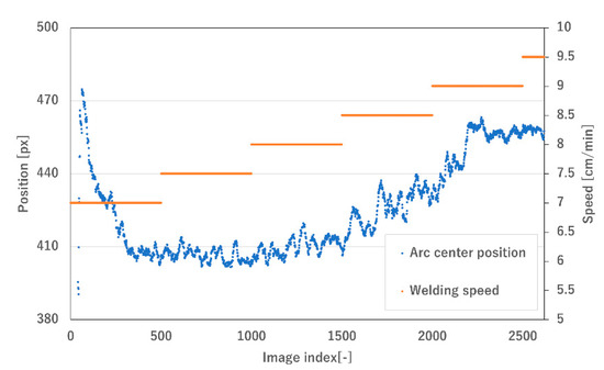 The control experiments were conducted on the HALCON platform, where the welding speed was dynamically adjusted according to the arc’s center position feedback. Based on the fundamental experiments’ parameters, a series of experiments were conducted to verify the feasibility of the proposed control system. In the following descriptions, the x-axis labeled “Image” indicates the index of captured frames during the welding process. Since images were recorded at 50 ms intervals, this axis can also be interpreted as a time axis.