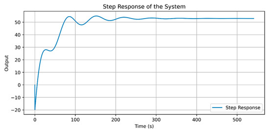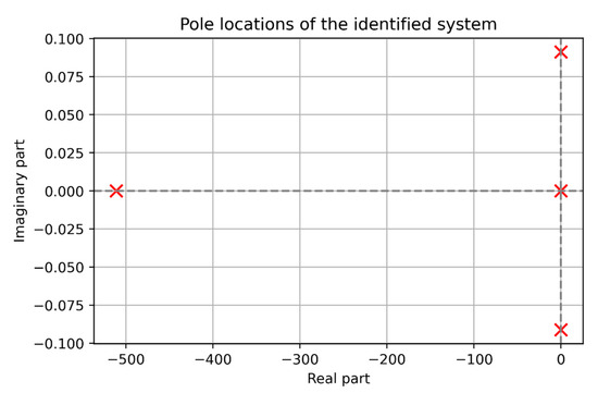 To evaluate the dynamic characteristics and stability of the identified model, a pole analysis and time domain step response were conducted. As shown in Figure 12, the identified transfer function exhibits one fast real pole on the far left of the complex plane, one real pole close to the origin, and a pair of complex–conjugate poles near the imaginary axis. These dominant poles result in a slow and lightly oscillatory system response, consistent with the step response behavior observed in Figure 11. As all poles are located in the left-half complex plane, the system is confirmed to be stable and suitable for use in controller design.