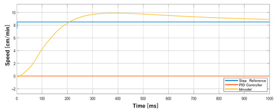 Both and are set to relatively low values to accommodate the system’s requirement for gradual changes in the output. To validate the stability of the closed-loop system, a step response analysis was conducted. In the simulation, the reference input was stepped from 7.5 cm/min to 8.0 cm/min, which corresponds to typical operating values observed in the experimental data (see Figure 10), ensuring the test scenario reflects realistic conditions. As illustrated in Figure 13, the system achieved stable convergence without significant overshoot. The response time was intentionally tuned to remain within a moderate range, preventing excessive or abrupt variations that could potentially compromise system stability.