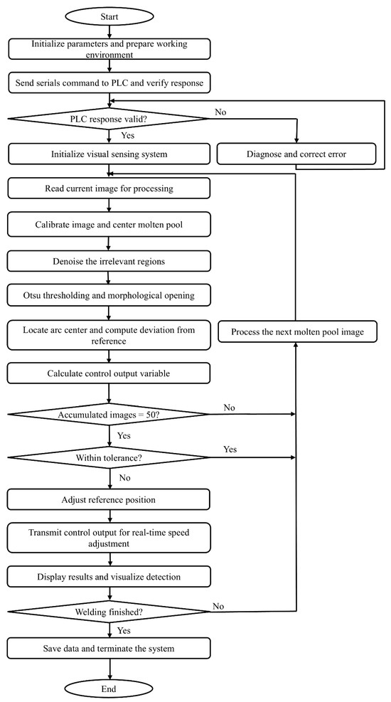 The control experiment workflow is illustrated in Figure 14. Before the welding control experiments, a transmission serial is sent to verify whether the communication system is functioning properly. Once a valid response is received, the experiment proceeds. The image processing steps follow the method described earlier. The system checks whether the current welding speed is appropriate by calculating the deviation between arc’s center position and reference position. If the deviation exceeds a certain threshold, the reference position is adjusted, and the updated value is sent to the controller in real time. Due to the system’s response delay, the judgment is made after accumulating 50 images, so that the speed adjustment is based on more stable data. As a result, real-time monitoring of welding state and adaptive speed control can be achieved.