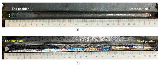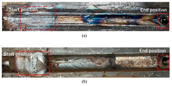 The final bead appearance of the control experiment (root gap: 4.0 mm–8.0 mm): (a) face side of the weld bead; (b) root side of the weld bead.