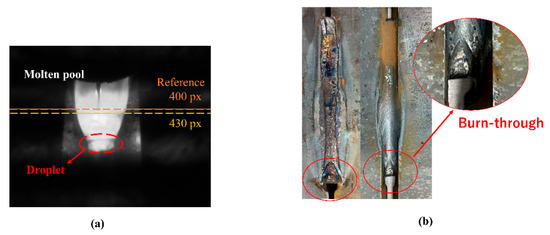 When implementing real-time control in pulsed MAG welding, it is crucial to avoid the occurrence of severe defects during welding. At the fundamental experiments stage, severe burnout phenomenon was detected as displayed in Figure 20. Once this condition develops, it becomes extremely difficult to recover and return to a stable welding process. Referring to Figure 5, that is because excessive welding speed increases droplet formation time, resulting in larger droplets that detach prematurely and may fall ahead of the molten pool. These oversized droplets can collapse under their own weight or electromagnetic forces, disrupting the arc and causing instability in the metal transfer process, ultimately degrading weld quality. In contrast, a near-burn-through condition, such as the one depicted in Figure 21, allows for timely corrective action. In such cases, adjusting the welding speed can promptly restore the molten pool to a stable state. The successfully controlled trend described above occurred during the previously discussed experiment with a root gap range of 5.3 mm to 7.3 mm. As shown in Figure 21b, no surface defects developed on the bead as a result of the observed phenomenon. In addition, the arc’s center position deviation from the reference position was approximately 30 px in the case of uncontrolled burn-through, whereas it was about 15 px in the case of controllable burn-through. This contrast further supports the suitability of the 400 px reference position.