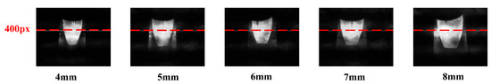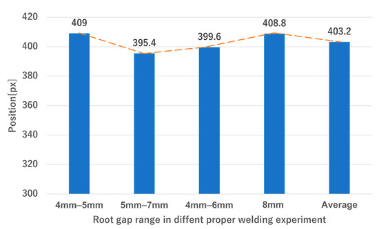 Since the reference position depends on the system configuration (e.g., camera resolution and optical setup), it was necessary to perform empirical calibration under the specific conditions used in this study. In the experiments conducted, the reference value was set to 400 px. To verify this setting, average arc’s center positions were calculated from several preliminary experiments under stable welding conditions, as shown in Figure 22. The 4–5 mm, 5–7 mm, and 4–6 mm experiments involved gradual root gap transitions, while the 8 mm experiment maintained a constant root gap. In all cases, the overall average arc’s center position was close to 400 px, confirming the validity of the reference setting. Figure 23 demonstrates that, under varying root gap conditions, the 400 px target consistently aligns with the center of the arc in the molten pool. This supports the appropriateness of the 400 px reference, which provides a solid basis for implementing arc-centered control strategies in subsequent experiments.