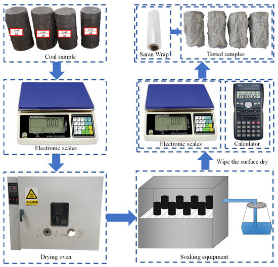 The following method was used to prepare coal samples under different immersion times: Firstly, coal samples were placed in an electric blast drying oven, with the temperature set at 105 °C, and dried for 24 h. After drying, coal samples were transferred to a dryer for further cooling until they reached room temperature; then, coal samples were weighed to obtain their dry mass. Secondly, at least three dry coal samples were placed in the immersion equipment, and samples were retrieved at predetermined intervals and weighed to test the mass variation in the coal samples under different immersion times. The samples were considered to have reached a saturated state when their mass no longer changed. Before the experiment, the coal samples were wrapped and sealed with plastic wrap to prevent the samples from weathering. Figure 1 shows the flow chart for preparing coal samples with different immersion times.