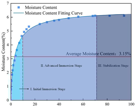 As shown in Figure 2, the moisture content of the coal sample increases with the increase in immersion time, and the water-absorption rate rises rapidly at first, slows down, and finally becomes stable. The immersion process can be divided into three stages: the early immersion stage, the late immersion stage and the stable stage. In the early immersion stage, with the increase in immersion time, the moisture content of the coal sample increases almost linearly, exhibiting a rapid growth rate. In the late immersion stage, with the increase in immersion time, the moisture content of the coal sample increases logarithmically, exhibiting a slow growth rate. When the immersion time is about 72 h, the stable stage is activated. The moisture content of the coal sample remains unchanged and progressively approaches saturation; after 72 h of non-destructive immersion, the moisture content of the coal sample is 6.11%, which is considered the saturation point.