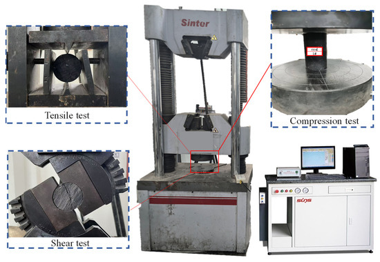 The fundamental mechanical properties of coal samples with different moisture contents were tested using a WAW-1000D microcomputer-controlled electro-hydraulic servo universal testing machine, manufactured by Sinter in Changchun, China, and purchased directly from the manufacturer. The equipment consisted of a host system, a servo-hydraulic source system, a microcomputer measurement and control system, a crossbeam, and a hydraulic chuck operating system. The maximum test force was 1000 kN, and the indication accuracy was 0.5. Figure 3 shows the process of testing coal samples with different moisture contents.