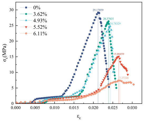 Figure 5 displays the test results and fitting curves, showing the influence of different moisture contents on the reduction in coal samples’ compressive performance.