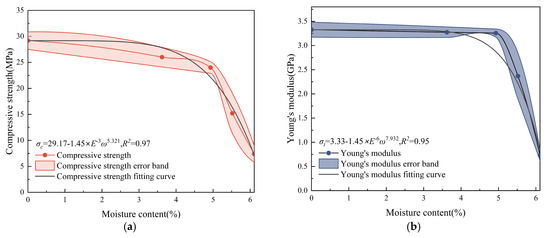 Fitting curves for moisture content and compressive performance of coal samples. (a) Compressive strength, (b) Young’s modulus.