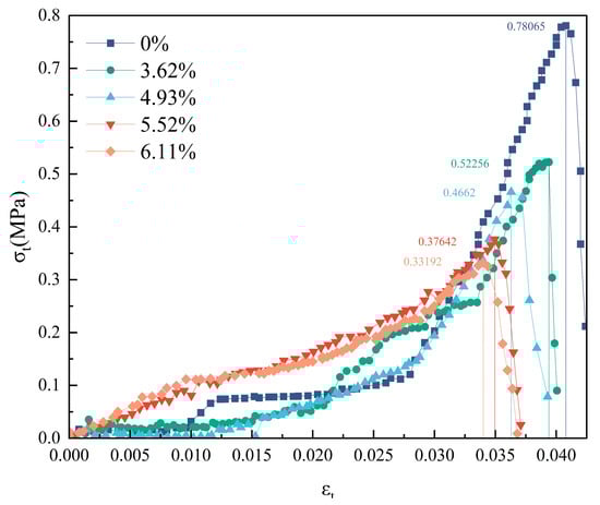 Figure 6 displays the tensile stress–strain curves of coal samples with different moisture contents.