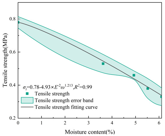 Figure 7 shows the test results and fitting curves, illustrating the influence of different moisture contents on the reduction in coal samples’ tensile performance.