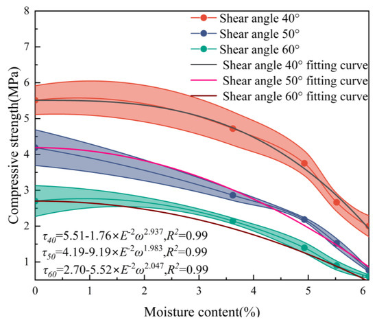 Figure 8 displays the test results and fitting curves, showing the influence of different moisture contents and shear angles on the reduction in coal samples’ peak shear strength.