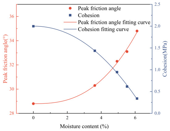 Based on the Mohr–Coulomb shear strength criterion, the peak friction angle and cohesion of coal samples under different moisture contents were obtained and fitted. The equation is as follows: