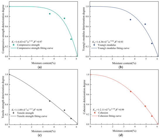 Fitting curves for moisture content and deterioration degree of coal samples. (a) Compressive strength, (b) Young’s modulus, (c) Tensile strength, (d) Cohesion.