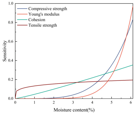 where SAc is the sensitivity index of compressive strength to moisture content; SAe is the sensitivity index of Young’s modulus to moisture content; SAt is the sensitivity index of tensile strength to moisture content; and SAco is the sensitivity index of cohesion to moisture content.