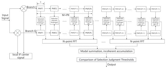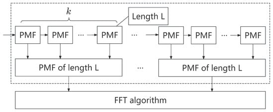 Assume the total integration data length is , which is divided into K segments, each of length X (). FFT-based correlation is performed on each data segment individually, and the results from each segment are then coherently or non-coherently accumulated. The PMF-FFT algorithm proceeds as follows: