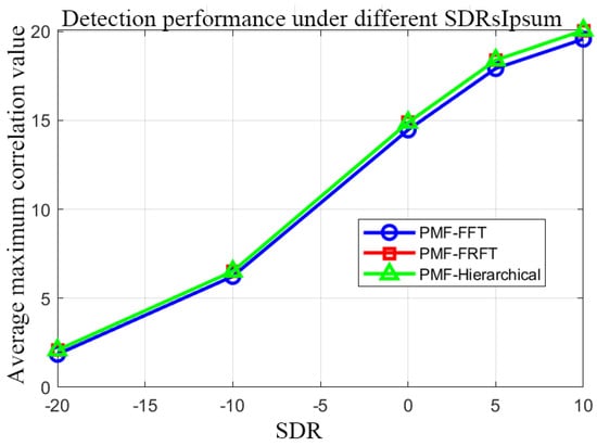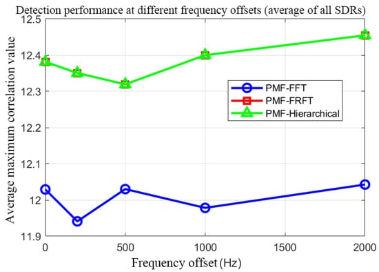 Figure 5 displays the average maximum correlation value as a function of the signal-to-noise ratio (SNR), averaged over all frequency offsets. As expected, the performance of all algorithms improved with increasing SNR. Again, the PMF-FRFT and the hierarchical algorithm showed congruent performance and slightly outperformed the PMF-FFT method. The performance enhancement from the FRFT-based methods was most pronounced at a low SNR of −10 dB, where they achieved a 4.91% improvement in correlation peak value.