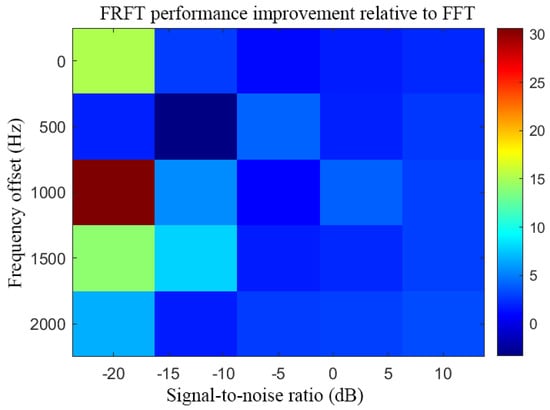 Figure 6 provides a heatmap that visualizes the percentage performance improvement of PMF-FRFT relative to PMF-FFT across a range of SNRs and frequency offsets. The improvement was calculated by dividing the maximum correlation value obtained by the FRFT method by that of the FFT method for each specified condition. The warmer tones on the heatmap indicate regions where the FRFT’s advantage was most significant. It is observable that in low-SNR scenarios with frequency desynchronization, the FRFT provided more robust detection capabilities.
