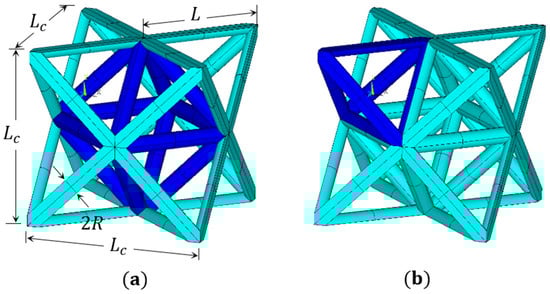 The octet-truss unit cell’s (UC’s) geometry is shown in Figure 1a. Here, Lc is the cubic unit cell side length. There are 36 struts of the same length, L, and radius, R. Joints are located at the face centers and at the corners. At each joint, 12 struts connect each other, resulting in a lattice connectivity of Z = 12. Octet-truss UC can be constructed in two ways, both are depicted in Figure 1a,b. In Figure 1a, the dark-colored cell inside, with circle-sectioned struts, is called the octahedral cell; the light-colored cell outside, with semi-circle sectioned struts, is called the all face-centered cubic cell (AFCC). So, the first way to build an octet-truss cell is constructed by inserting the octahedral cell inside the AFCC cell. In Figure 1b, the dark-colored cell, with semi-circle sectioned struts at the corner, is called a regular tetrahedral cell; the second way to build an octet-truss is through the replication of eight tetrahedrons through mirror symmetry.
