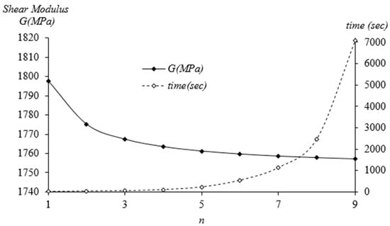 One cell of the octet-truss was used as the RVE in this study; but, in order to also inspect the effect of the number of unit cells in the RVE, more than one cell was also introduced through the homogenization process for = 0.5. It was observed that the elastic modulus and Poisson’s ratio were 3189.60 MPa and 0.292, respectively, independent from the number of unit cells of RVE. Decreasing homogenized shear modulus values with increasing number of unit cells (n × n × n) in RVE and the computational cost of simulations in seconds for n = 1, 2, …, 9 are tabulated in Table 3 and plotted in Figure 3. The execution time for n = 9 was almost 2 h. The hardware of the computer used in this study was not sufficient to obtain the solution for 10 × 10 × 10 unit cells. An RVE with n = 9 gives a 2.3% smaller shear modulus value than an RVE with n = 1.