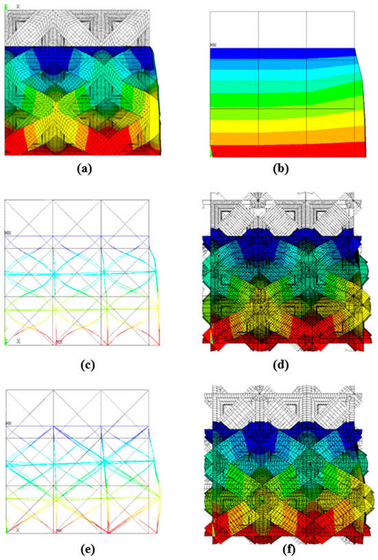 Example 1: Deformed shape of 1/8 of lattice structure models under compression with 3 unit cells modeled with four models: (a) solid, (b) homogenized bulk, (c) beam with stiff joints without section display, (d) beam with stiff joints with section display, (e) beam with springs without section display, and (f) beam with springs with section display.