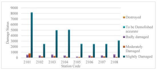 57], the city reported 49 completely collapsed buildings, 62 buildings requiring immediate demolition, 6105 severely damaged buildings, 3747 moderately damaged buildings, and 54,721 slightly damaged buildings. The damage distribution at the locations of the seismic stations is illustrated in