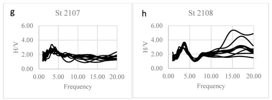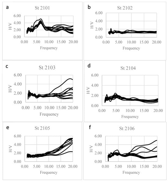 44]. The H/V ratio varies with frequency, reaching its maximum at the dominant frequency and decreasing at higher frequencies. This characteristic makes the H/V method an effective tool for determining a site’s vs. structure [