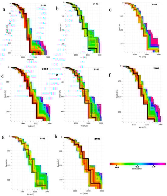 Section 2.3 for details). Microtremor measurements were conducted at eight locations across seven districts. For each station, phase velocities were converted into one-dimensional shear wave velocity profiles, which are presented in