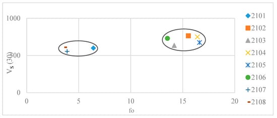 Soil classification is based on the average velocity (Vs30) within the upper 30 m. A high average shear wave velocity indicates that the soil is hard and solid. Two groups of different ground conditions have been identified. Accordingly, relatively low Vs30 and low frequency values were observed at stations 2101, 2107, and 2108, while high frequency and Vs30 values were obtained at other stations (