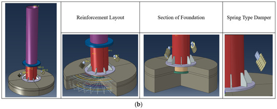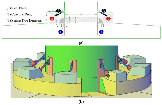 The developed strengthening design consists of a concrete ring, steel plates, and spring-type dampers, which are applied around the embedded ring–foundation joint area forming the tower–foundation connection and are ring-shaped in plan. The developed retrofit/strengthening design mainly consists of three main applications: (i) placing steel plates (flag plates—feder) in the tower–foundation joint area, (ii) sealing the placed steel plates with concrete ring, and (iii) then, adding spring-type dampers to complete the retrofit/strengthening design (Figure 1).