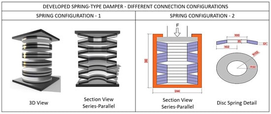 Disk springs (Belleville springs) are used in the spring-type damper developed to strengthen the tower–foundation connection (Figure 2). Disk springs are preferred due to their ability to carry large loads in small volumes, and at the same time, they can be brought to the desired capacity by adding and removing springs. Disk springs can be connected in series or in parallel to achieve different force-response characteristics. When connected in series, greater deflection (deformation) is achieved, while when connected in parallel, higher load capacity is obtained. These connection methods allow the system’s rigidity and energy-damping capacity to be adjusted as desired. In the developed spring-type damper, disk springs are connected both in parallel and in series to increase both deformation capacity and load-carrying capacity. By changing the connection configurations and the number of springs, the spring capacity can be adjusted to the required level. Disk spring elements are manufactured from 50 CrV4 alloyed special steel material. 50 CrV4 spring steel is an alloyed material delivered in a pre-hardened state. Unlike other carbon and alloy steels, 50 CrV4 material possesses high hardness, resistance to heavy loads, and the ability to operate at high temperatures up to 300 °C. The minimum yield strength of 50 CrV4 steel is 550 MPa for diameters up to 250 mm.