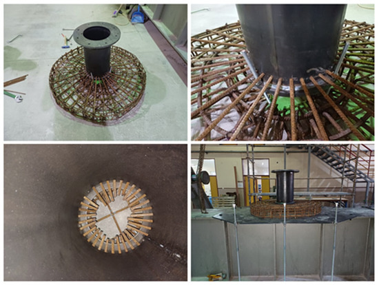 Two identical wind turbine specimens to be used in laboratory experiments were manufactured in λ:1/15 scale. Working visuals of the fabrication are presented in Figure 5. The circular foundation diameter for both specimens is 1.2 m, and the foundation height is 0.20 m. Turbine heights are 2 m from the bottom of the foundation to the horizontal load impact point. In both specimens, the flange element in the embedded ring was placed approximately 70 mm below the top of the foundation. The experimental setups of the reference and strengthened specimens are shown in Figure 6.
