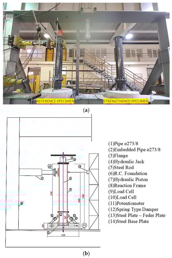 (a) Reference and strengthened specimen, (b) the experimental setup.