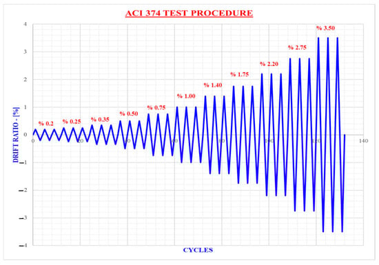 After the completion of the experimental setups and spring-type damper mechanical tests, tests of the 1/15 scale models were carried out under cyclic loads. The test procedure specified in ACI 374.1.05 (2005) [38] was applied for both specimens. Cyclic loads consisting of gradually increasing displacement-controlled push and pull forces were applied to the reference and strengthened specimens. The test procedure was established according to the displacement template established according to ACI 374.1.05 (2005) [38]. Displacement-controlled cyclic loads were applied to both specimens for a total of 11 displacement ratios (0.2%, 0.25%, 0.35%, 0.50%, 0.75%, 1.00%, 1.40%, 1.75%, 2.20%, 2.75%, and 3.50%) representing the damage conditions (Figure 8).