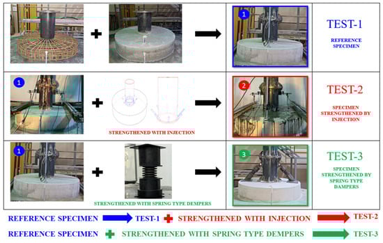 Cyclic loading tests were performed on the reference specimen according to the test procedure described in ACI 374.1.05 (2005) [38], and the characteristic force–displacement curve of the reference specimen was obtained. After the tests were completed, the reference specimen was reinforced with injection resin, and the tests were repeated to investigate the effect of the reinforcement by injection on the foundation. The injection resin was injected into the foundation using injection dowels (injection packers). As a result of the tests, it was predicted that cracks and voids were intensively formed around the embedded ring base flange, and injection packers were placed by targeting this region. Injection packers were placed in the foundation in a way to cut the cracks formed on and inside the foundation perpendicularly. Injection packers were placed in the tower–foundation junction area where cracks occur intensively. In this way, the effect of the injection method, which is frequently preferred in the strengthening of existing wind turbine foundations, was also determined. The same test procedure was applied to the specimen strengthened with spring-type dampers, and the effect of both strengthening methods on the foundation was obtained comparatively. The test procedures are summarized in Figure 9.