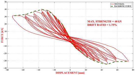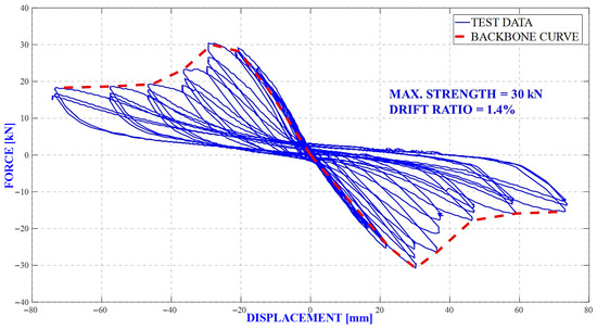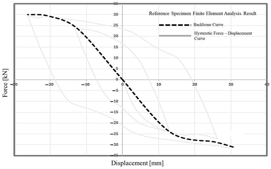 Cyclic loading analysis performed on the finite element model of the reference specimen resulted in the hysteretic force–displacement and backbone curve (Figure 18).