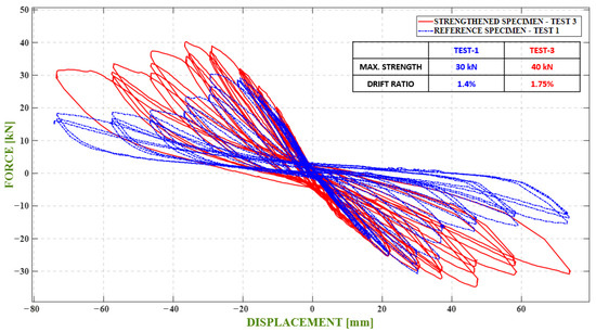 The hysteretic force–displacement curves obtained for both tests are presented in Figure 12 for comparison of the results.