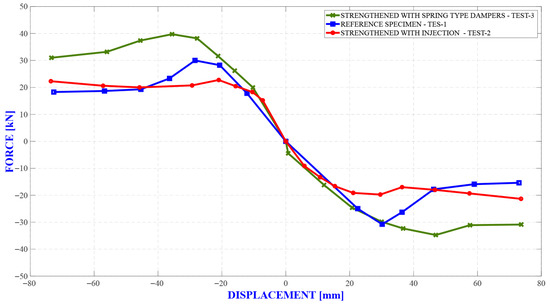 The effect of the strengthening methods applied was determined by comparing the backbone curves generated from the hysteretic force–displacement curves obtained as a result of cyclic loading tests (three tests in total) on the reference and strengthened specimen (Figure 13).