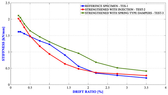 As expected, the additional lateral resistance (stiffness) provided by the spring elements is much higher than both the reference case lateral resistance and the lateral resistance provided after repairing/reinforcement with injection resin (i.e., the reinforced specimen reaches higher lateral load carrying levels compared to the reference specimen and the injection repaired/reinforced reference specimen). The reference specimen repaired/reinforced by injection reaches the lateral load-carrying capacity earlier compared to the other two cases. The specimen strengthened with springs increased the lateral load-carrying capacity by about 33% compared to the reference specimen, and the value of the translation ratio at which the load-carrying capacity was reached and shifted from 1.40% to 1.75%. This shows that the springs contribute positively to the system ductility. No increase in lateral load-carrying capacity was observed in the repairing/strengthening process with injection resin compared to the reference specimen. The repairing/strengthening treatment with injection resin enabled the reference specimen to maintain the load-carrying capacity (approximately 20 kN) at the end of the 3.50% drift ratio (i.e., the system can continue to operate from the point where it left off without capacity reduction). It can also be clearly seen from the backbone curves that the repairing/strengthening with injection resin provides additional ductility to the system. It is seen from the results of cyclic loading tests that the treatments with injection resins, etc., have a restorative effect on wind turbine foundations rather than strengthening. The stiffness change curves of the tested specimens are presented in Figure 14.