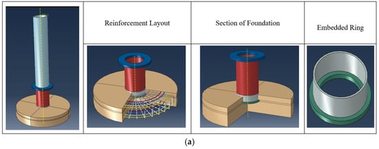 The existing wind turbine foundation was analyzed under design loads, and then the elements in the strengthening method were added to the finite element model, and the analyses were repeated under the same loads, and the improvement in the foundation was determined. A three-dimensional finite element model of the existing wind turbine foundation was created in ABAQUS [39] software (Figure 23). The finite element model consists of a concrete foundation and a steel embedded tower. In the finite element model, an eight-point Hex finite element type was used. The interaction between the embedded tower part and the concrete foundation was modeled by defining friction in the normal and tangential directions between the contact surfaces. The coefficient of friction between concrete and steel elements in the finite element models was assumed to be 0.7 [41]. One-dimensional spring elements representing the soil were defined at the base of the concrete foundation. The existing foundation is circular with a diameter of 16.7 m. The depth of the foundation is 2.53 m, and the embedment depth of the embedded ring in the foundation is 1.58 m. The ratio of the embedment depth to the foundation depth is 0.62. The foundation volume is approximately 650 m3, and the total weight of reinforcement (rebar) in the foundation is 48.47 tones. The total weight of the foundation is 1480 tones. The material class and quality used in the foundation are C25/30 for concrete and S420 for reinforcement. The wind turbine tower is of structural steel grade S355. The existing tower generates electricity with a power of 3 MW, and the tower hub height is 78.33 m. The load values provided by the manufacturer in the tower design are given in Table 3. The loads specified in Table 3 were defined at the junction point (Loading Point) where the loads are transferred to the upper surface of the foundation by the tower, and the analyses were performed.