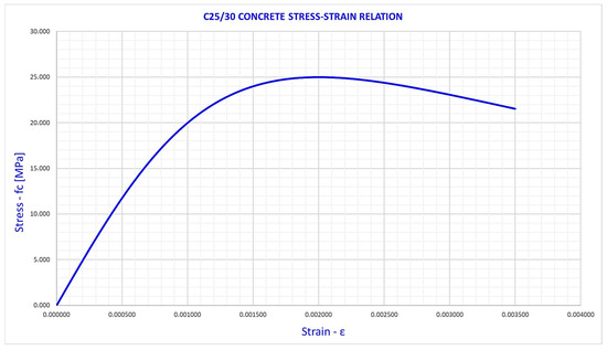 The material properties used in the finite element models were obtained from material tests. In the finite element analyses, foundation concrete is C25/30, reinforcing steel is S420, steel tower and plates are S355, and disk springs are 50 CrV4. The concrete model in the C25/30 class was created using the Mander [40] model (Figure 16). For the reinforcing steel bars placed within the foundation, material from the S420 steel grade with a yield strength of 420 MPa was used. For the S420 grade steel material, the elastic strain (εy) is approximately 0.002, while the total strain (εu) before failure can reach up to 0.20. The embedded steel ring and tower were modeled as an elastic material with a yield stress of 355 MPa. The Density, Modulus of Elasticity, and Poisson’s Ratio were taken as 7800 kg/m3, 200 GPa, and 0.3, respectively. The properties of special alloy steel material in the 50 CrV4 grade have been used for disk spring elements. 50CrV4 is a low-alloy chromium–vanadium spring steel known for its excellent mechanical performance, especially under dynamic loads. It offers high tensile strength (typically between 1000 and 1300 MPa), yield strength of at least 800 MPa, and good elongation (≥10%), making it suitable for components requiring resilience and fatigue resistance. The steel also exhibits hardness values around 280–350 HBW after heat treatment and maintains decent impact toughness (≥30–40 J at room temperature). With a modulus of elasticity of approximately 210 GPa, 50CrV4 is commonly used in the manufacturing of automotive suspension springs, torsion bars, clutch components, and other mechanically stressed parts where durability and toughness are essential.