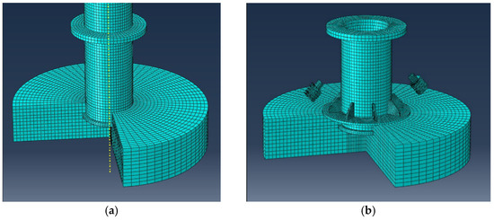 The concrete foundation, steel tower, and embedded tower part are suitable for a Hexahedral (Hex) mesh as a geometric shape. The Hex mesh system allows the use of fewer finite elements compared to other mesh systems. In the finite element model created, an eight-point Hex mesh was preferred (Figure 17). The interaction between the embedded tower part and the foundation concrete was modeled by defining friction in the normal and tangential directions between the contact surfaces. The coefficient of friction between concrete and steel elements in the finite element models was assumed to be 0.7 [41]. Smaller sized finite elements (mesh) were used in the contact zones between the embedded tower part and the foundation concrete. The base of the concrete foundation in the finite element models is defined as a built-in support with constraints in all degrees of freedom. A displacement-controlled horizontal load was applied to a reference point connected to the top surface of the steel tower and analyses were performed under cyclic loads. In order to obtain accurate results in finite element analyses, the model must be divided into the correct and sufficient number of finite elements. Convergence analyses were performed on the finite element model and the size and number of finite elements were determined in order to obtain reliable results.