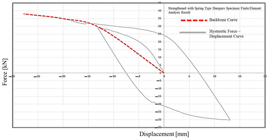 Cyclic loading analysis performed on the finite element model of the strengthened specimen with a spring-type damper specimen resulted in the hysteretic force–displacement and backbone curve (Figure 20).
